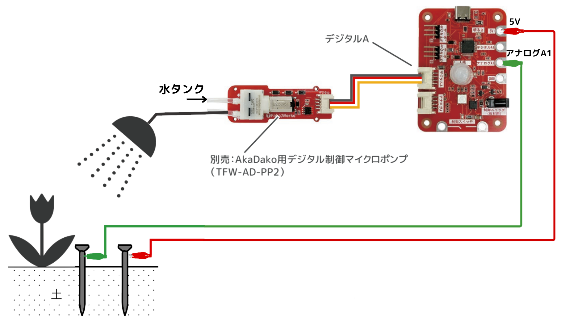 土が乾いたら自動的に水を撒く装置のプロトタイプを作成します。
