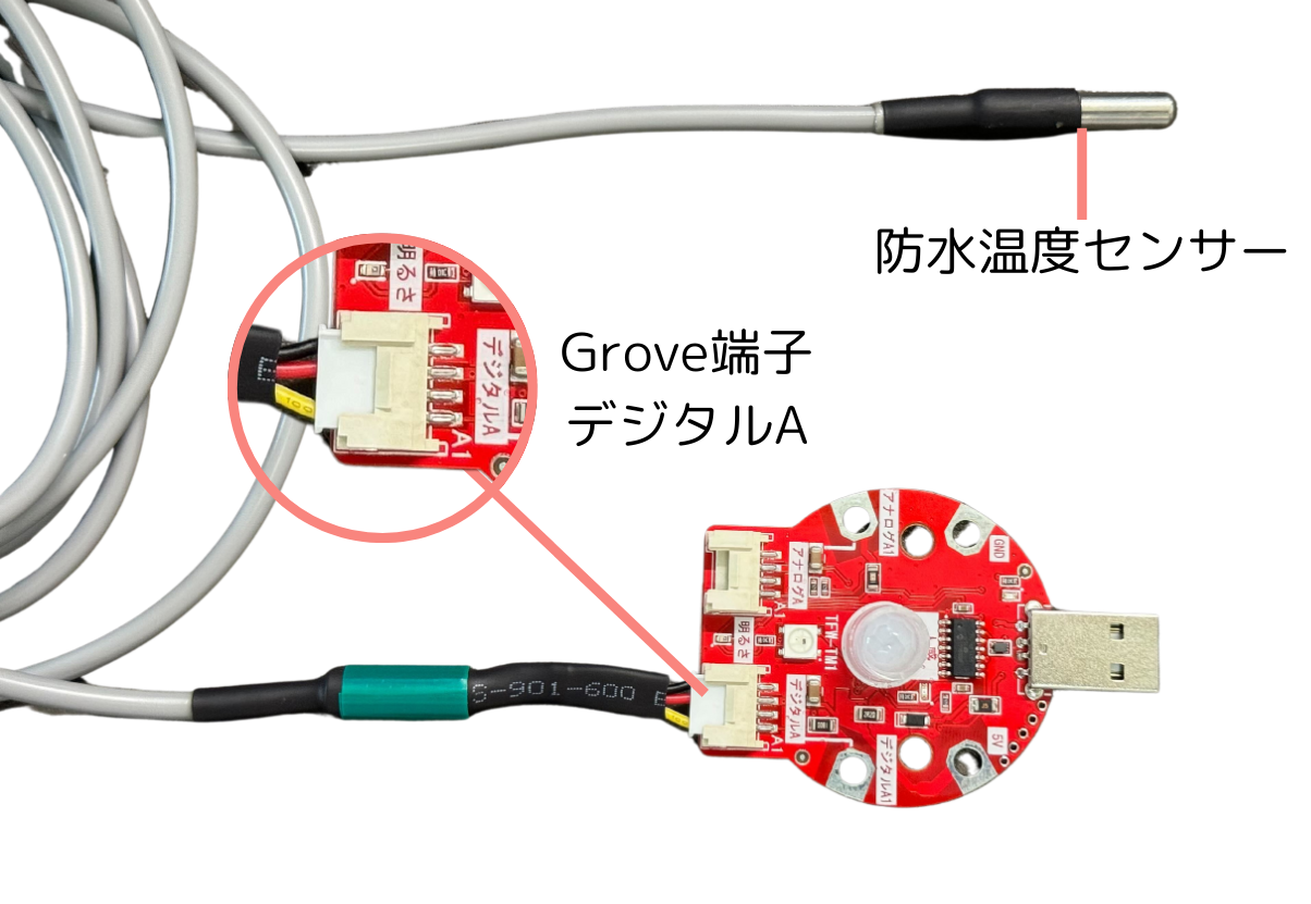 - 防水温度センサーをGrove端子の「デジタルA」に差し込む。