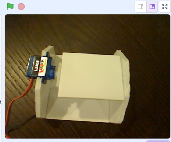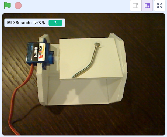 - ステージに「ML2Scratch:ラベル 1」と表示されます。この値が、真っ直ぐな釘を置いた状態では2.曲がった釘を置いた状態では3になればOKです。