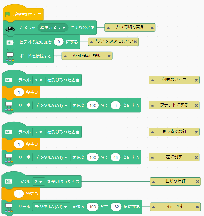 - フラットになった角度をベースに、+40度と-40度になるようプログラムを作ります。サンプルでは8度でフラットだったため、ラベル2で+48度。ラベル3で-32度にしています。ポイントとしては、サーボを動かす前に「1秒待つ」を入れたほうが、釘を置き終わる前に動いてしまう事故を防止できます。