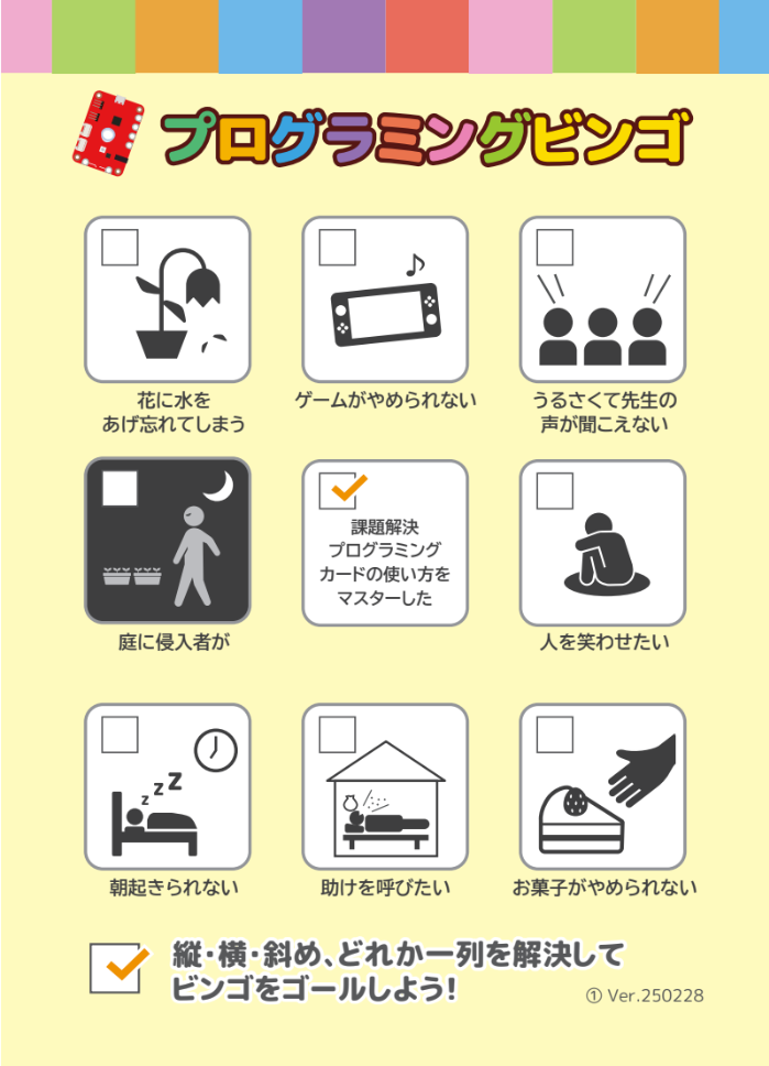 ※課題解決プログラミングカードの使い方を理解していることが前提です。(そのため、ビンゴの中央のマスはあらかじめチェック済みになっています)
