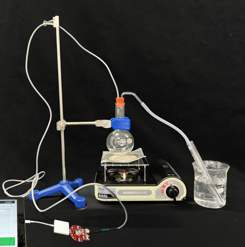 - 一般的には、棒温度計の温度を目視し記録してグラフを描きますが、AkaDako探究ツールなら、温度のグラフをリアルタイムで確認することができます。