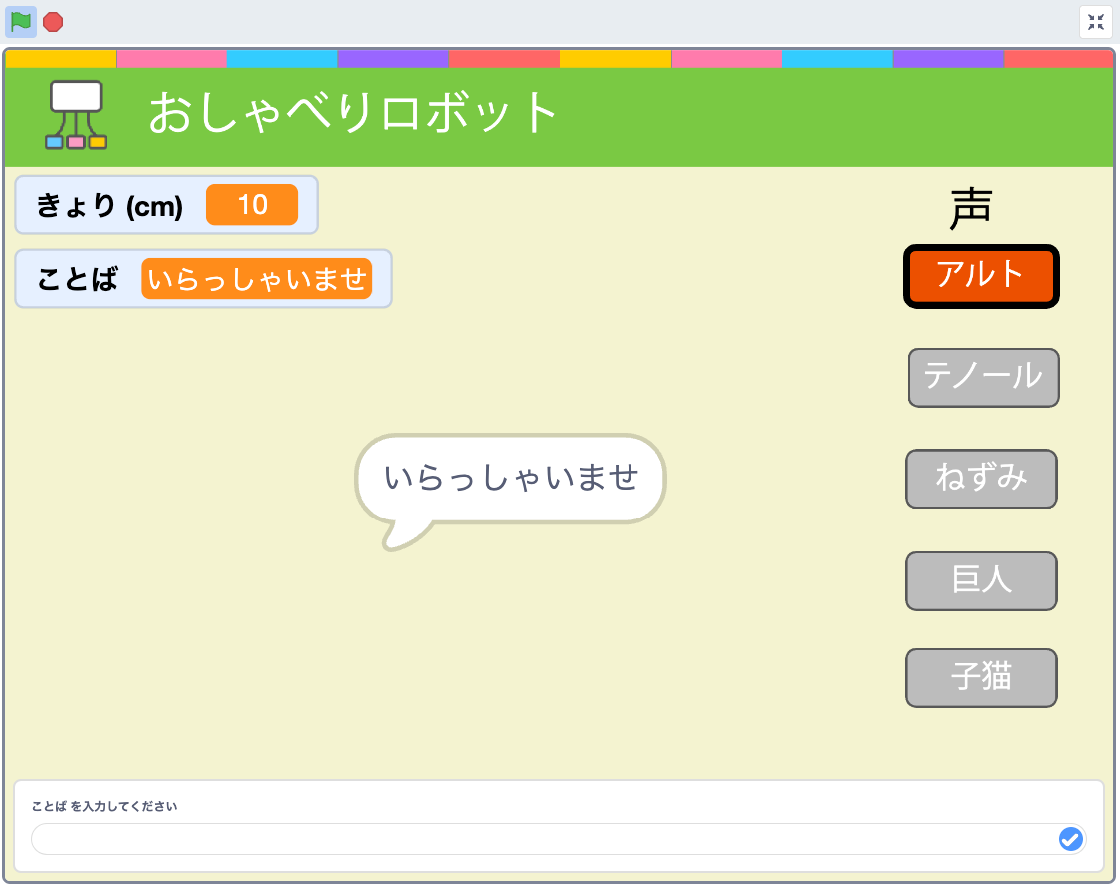 「ことばを入力してください」のところに、しゃべって欲しい文書を入力し、右のチェックボタンをクリックすれば、ことばを変更することが出来ます。