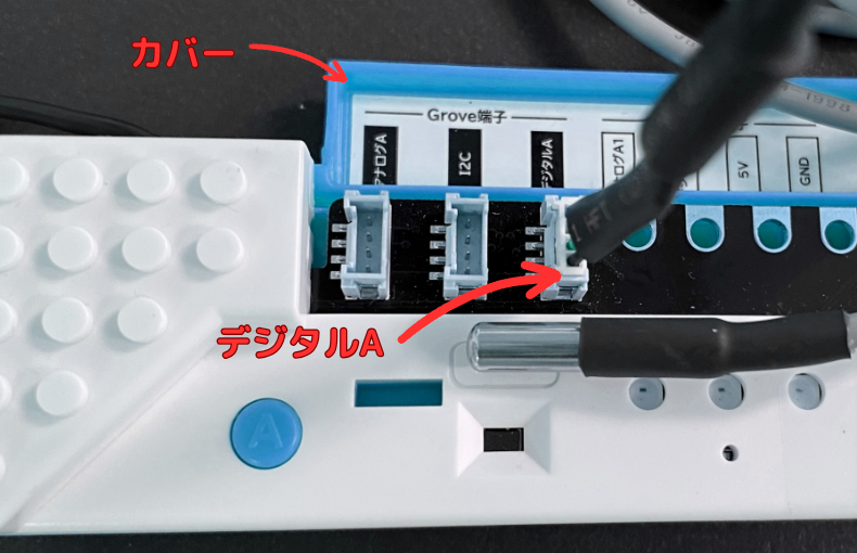 - 防水温度センサーをGrove端子の「デジタルA」に差し込む。
