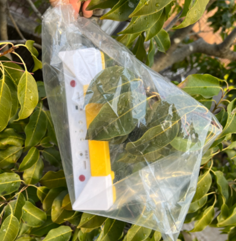 - 植物に被せた袋の中に、AkaDako探究ツールを入れ、袋の口をしっかりと閉じる。