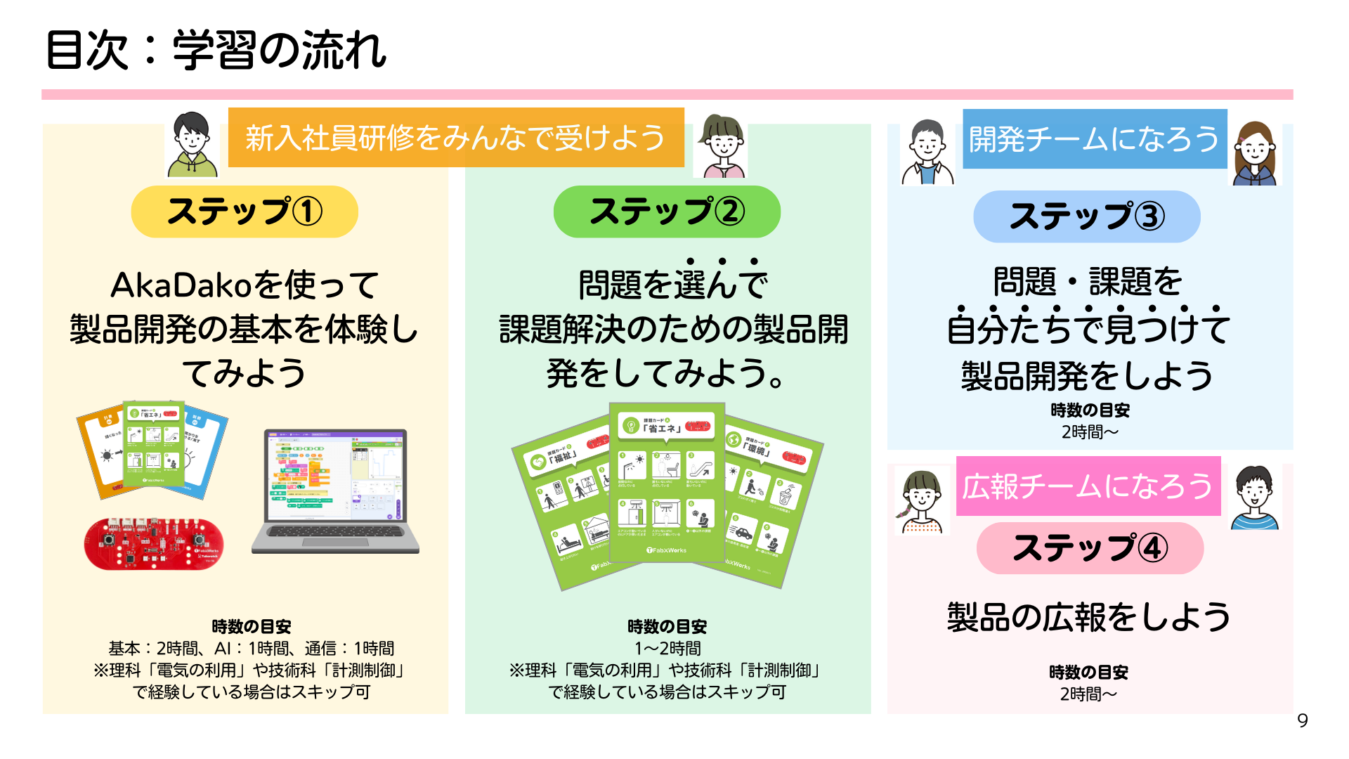 この教材は、AkaDakoを活用して、子どもたちが実社会にある「困りごと」に向き合いながら、自ら課題を見つけ、解決に挑戦する学びを体験できる構成となっています。