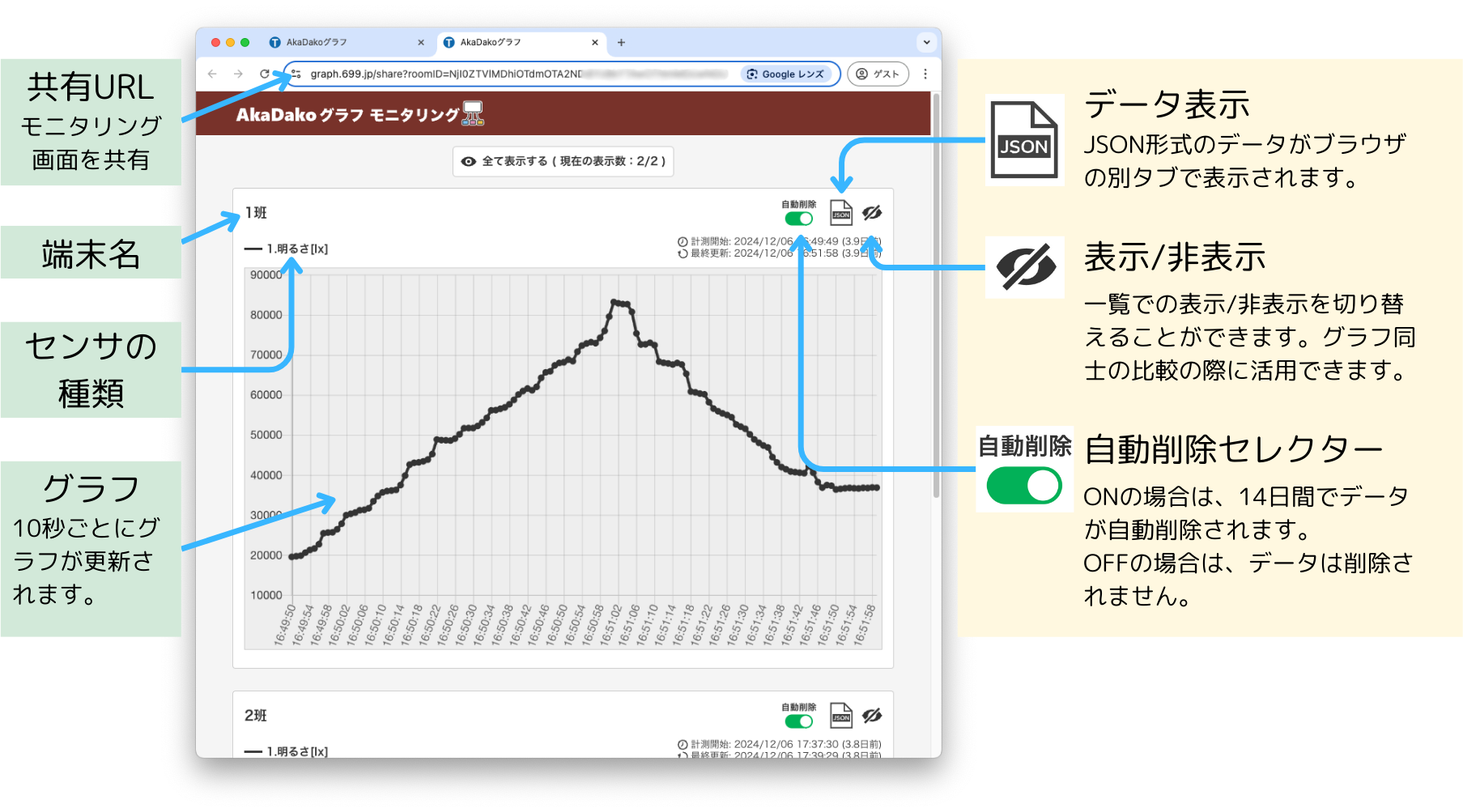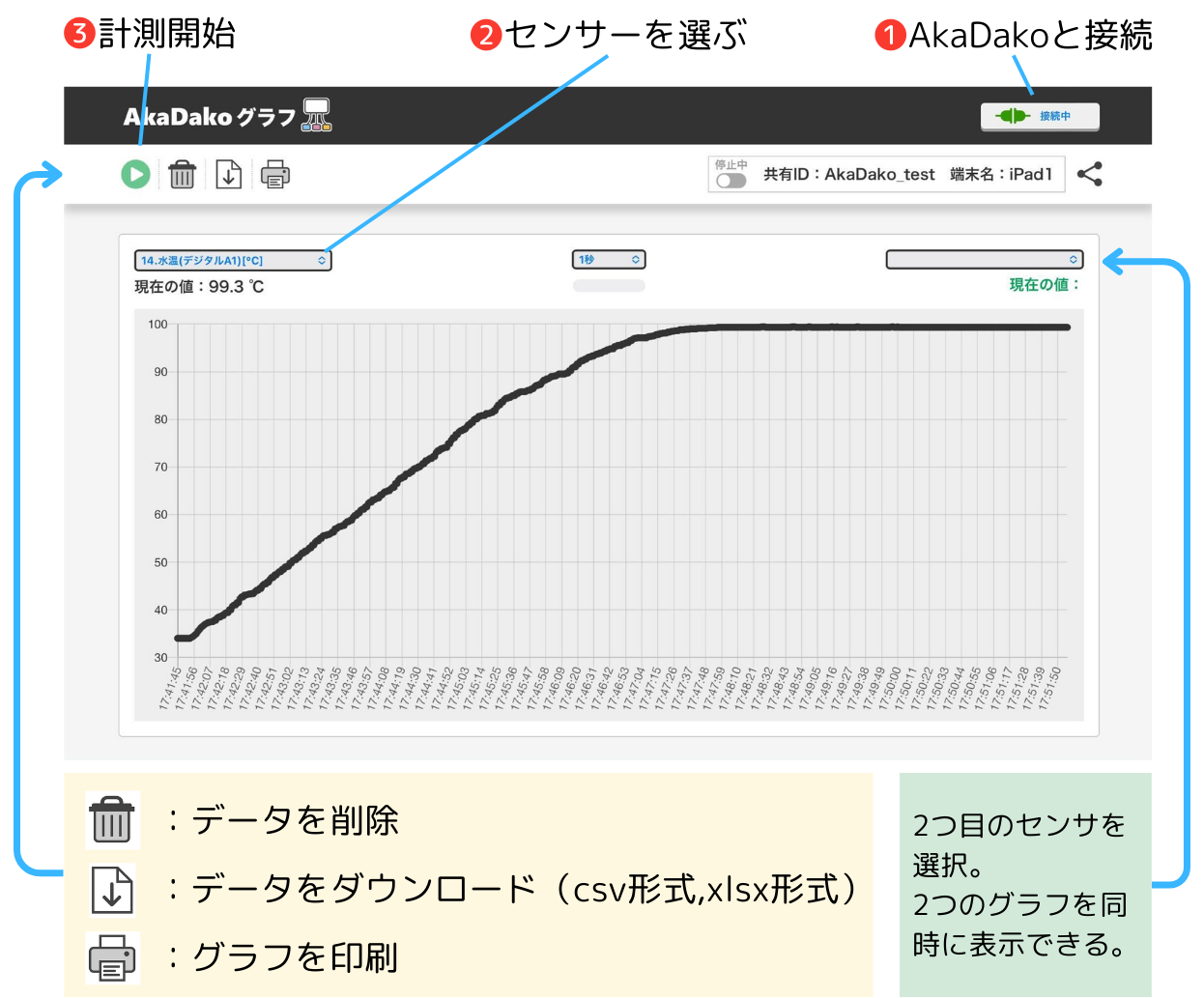 AkaDakoクラウドグラフを使うと、センサーで測定したデータをリアルタイムで視覚化できます。また、データはExcelやCSV形式でダウンロード可能で、複数のPCやタブレット間でグラフを共有する機能も備えています。