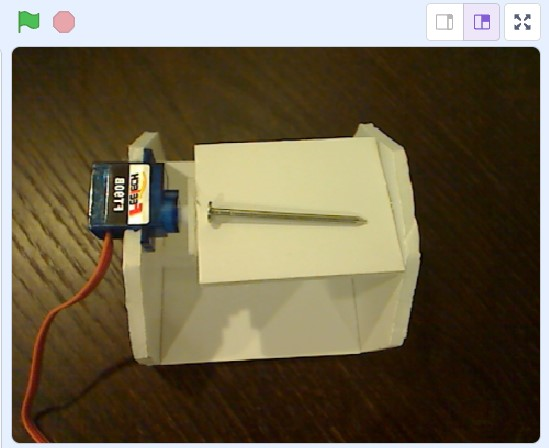 - ステージに「ML2Scratch:ラベル 1」と表示されます。この値が、真っ直ぐな釘を置いた状態では2.曲がった釘を置いた状態では3になればOKです。