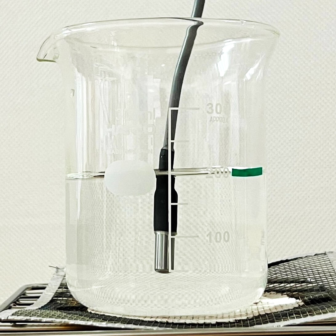 - 棒温度計を使用するところを、防水温度センサーに置き換える。(防水温度センサーの先端を、水の中に入れる。ケーブルは、火に当たらないようにスタンドの上を通す。)
