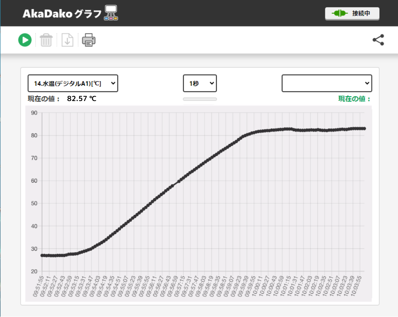 - 一般的には、棒温度計の温度を目視し記録してグラフを描きますが、AkaDako探究ツールなら、温度のグラフをリアルタイムで確認することができます。
