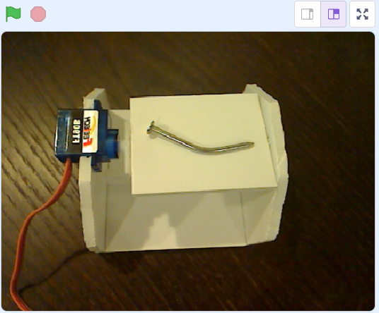 - ステージに「ML2Scratch:ラベル 1」と表示されます。この値が、真っ直ぐな釘を置いた状態では2.曲がった釘を置いた状態では3になればOKです。