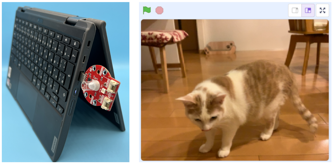 - まずは、用意されているプログラム改善用ブロック(下図参照)をプログラムに組み込んで改善してみましょう。ScratchとAkaDakoに慣れている人は左の▶を押してブロック一覧から自由にブロックを選びオリジナルの防犯カメラを作ってみてください。