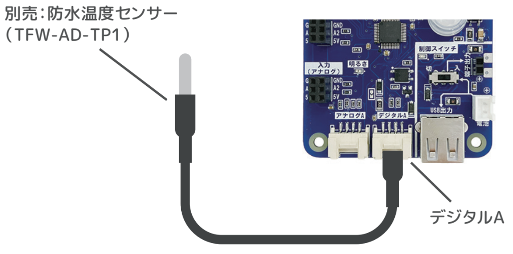 - 防水温度センサーをGrove端子の「デジタルA」に差し込む。