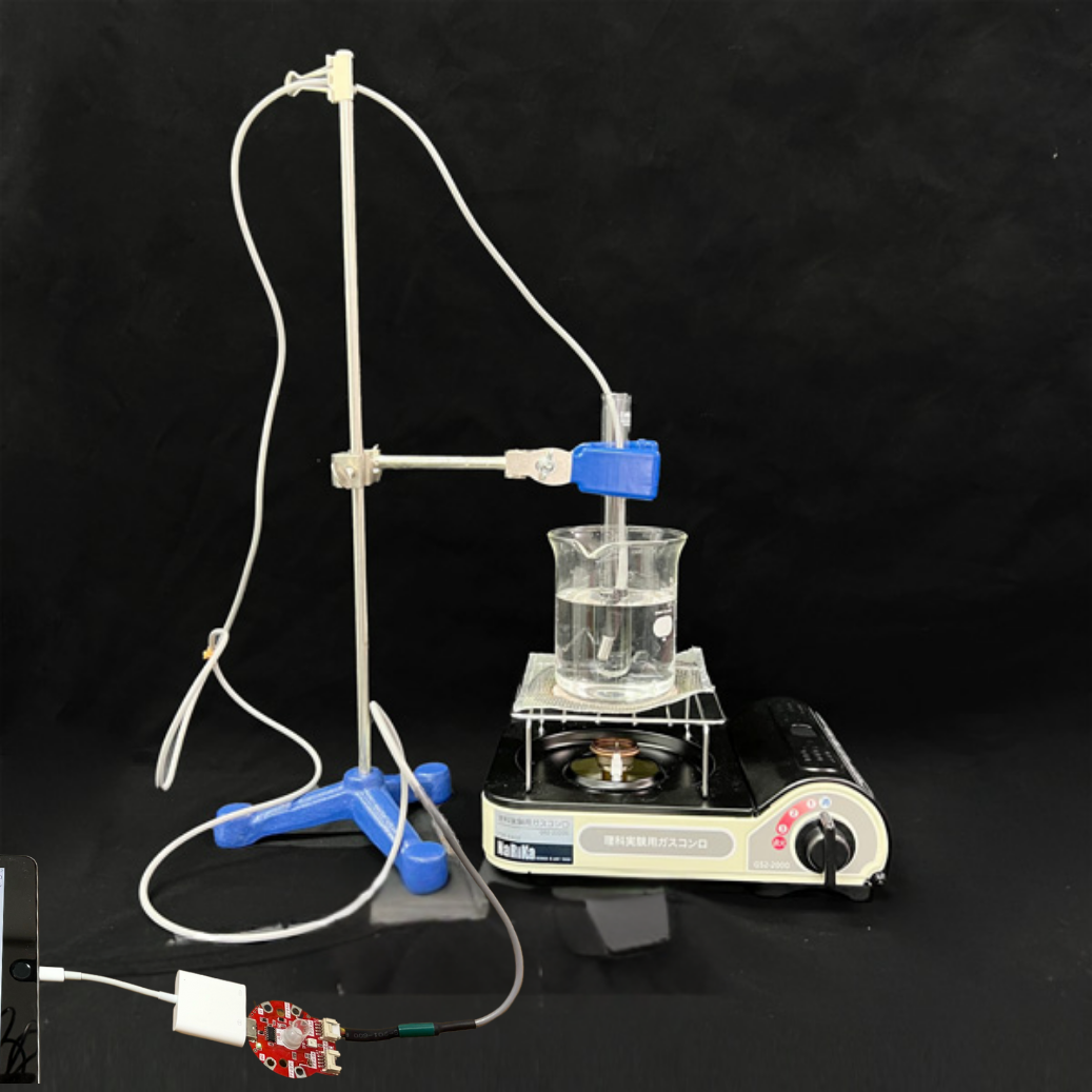 - 一般的には、棒温度計の温度を目視し記録してグラフを描きますが、AkaDako探究ツールなら、温度のグラフをリアルタイムで確認することができます。