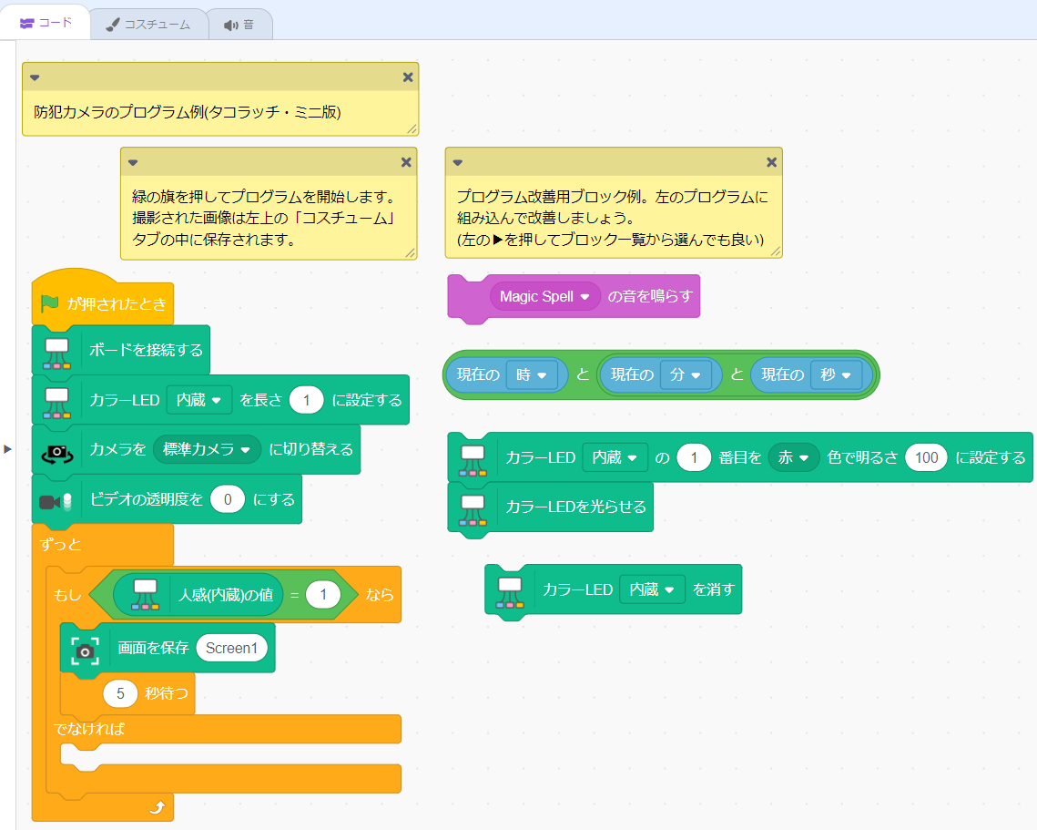 - まずは、用意されているプログラム改善用ブロック(下図参照)をプログラムに組み込んで改善してみましょう。ScratchとAkaDakoに慣れている人は左の▶を押してブロック一覧から自由にブロックを選びオリジナルの防犯カメラを作ってみてください。
