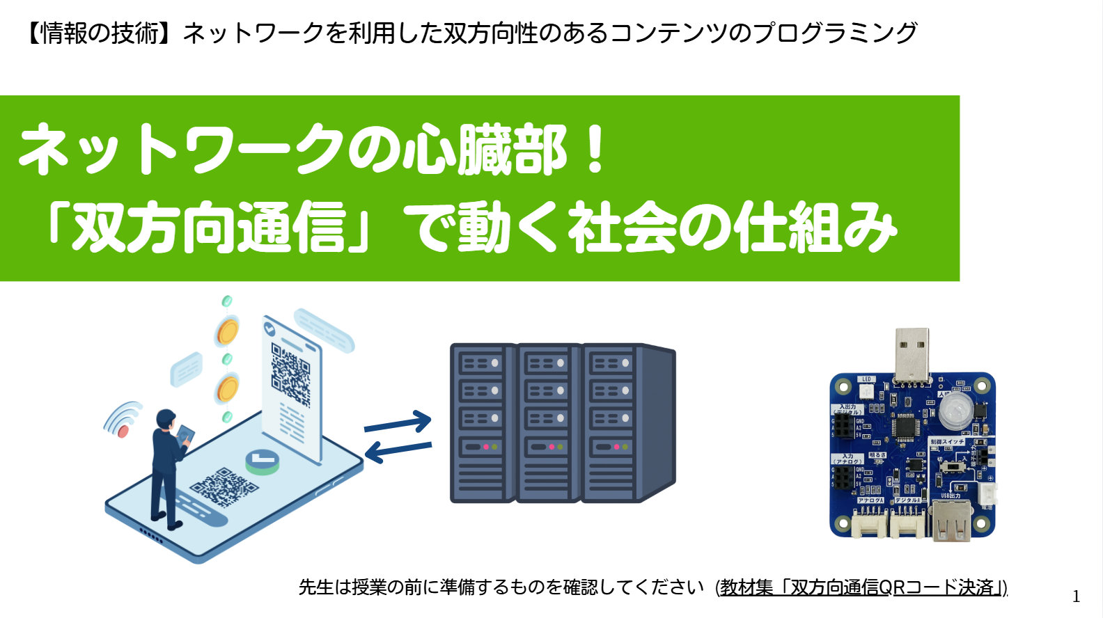 スライドに沿って学習を進めれば、QRコード決済のプログラム体験をしながらネットワークを利用した双方向通信について効率的に学ぶことができます。