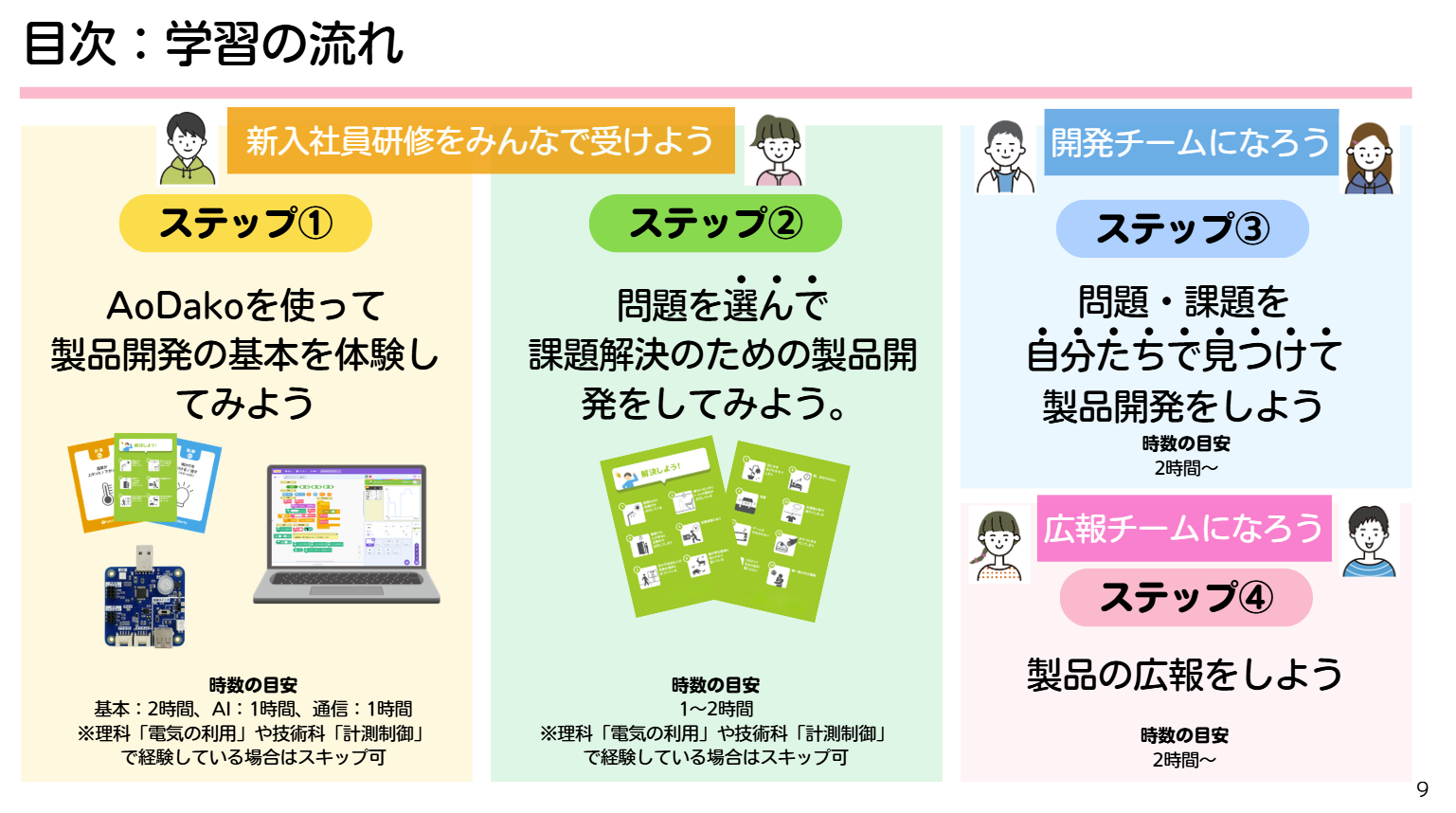 この教材は、AoDakoを活用して、子どもたちが実社会にある「困りごと」に向き合いながら、自ら課題を見つけ、解決に挑戦する学びを体験できる構成となっています。